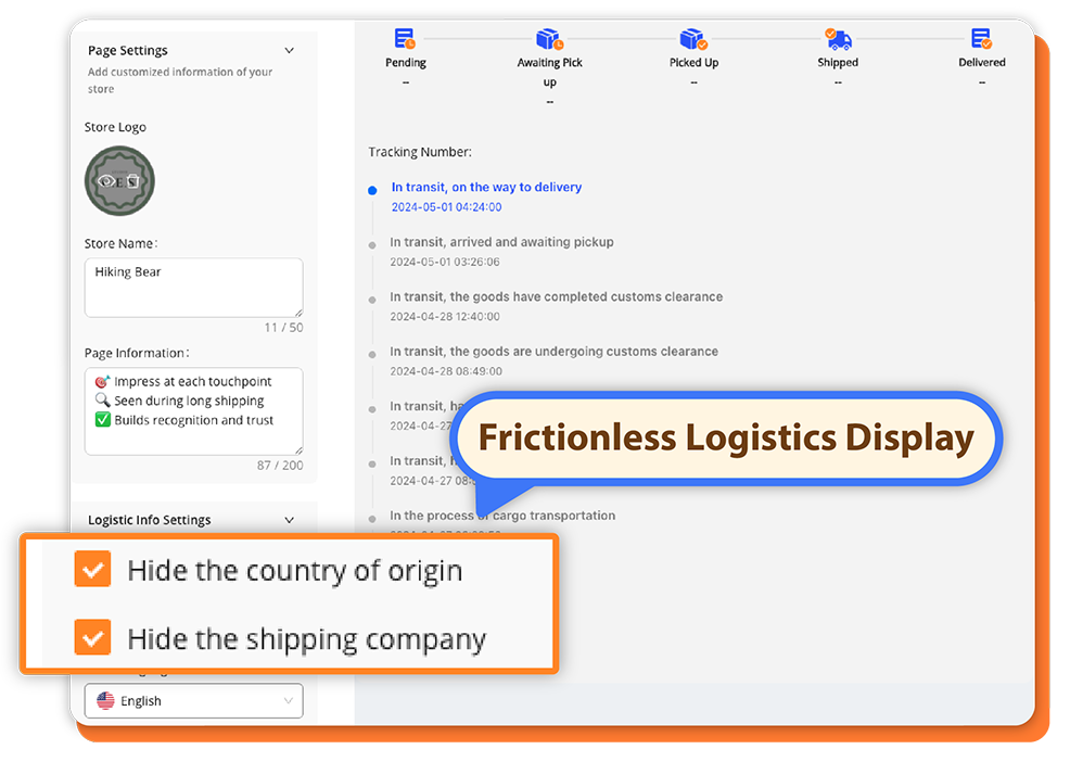 - Control the Narrative (Logistic Info Settings): Seeing "Origin: China" or unknown carriers like "Yanwen" can cause anxiety about shipping times. DSers allows you to hide the origin country and mask carrier information. The customer focuses on the progress, not the geography.